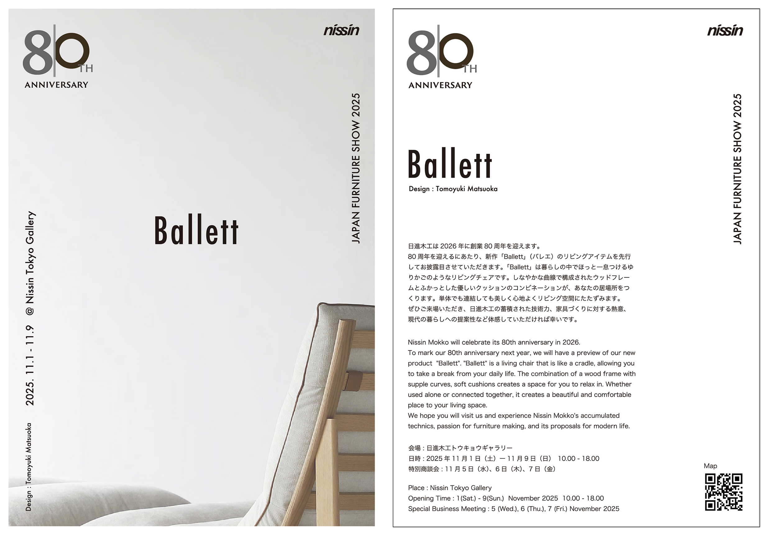 2025.10.06 最新情報 Tweet JAPAN FURNITURE SHOW by IFFT 参加のお知らせ 日進木工ではJAPAN FURNITURE SHOW期間中、 トウキョウギャラリーにて特別展示をいたします。ぜひご来場ください。 80周年記念モデル プレ発表 期間限定特別展示 11/1(土)~11/9(日) 10:00〜18:00 周年イヤーの幕開けとしてプロダクトデザイナー松岡智之氏による80thモデルのプレ発表を行います。来年発表予定のフルラインナップから、今回はリビングアイテムをひと足早く、ご来場の皆さまにお披露目いたします。ぜひゆったりと優しく包み込まれる感触をご体感ください。 80周年記念モデルデザイナー松岡智之氏在廊 フリートークイベント 11/5(水)~11/7(金) 期間中3日間松岡智之氏がトウキョウギャラリーに在廊します。デザインやものづくりに対する思いなどをご来場いただいた皆さまとオープンにお話いただければと思っております。楽しいひと時をお過ごしください。 ※フリートークとなります。時間帯やタイミングによりお話いただけない場合もございます。